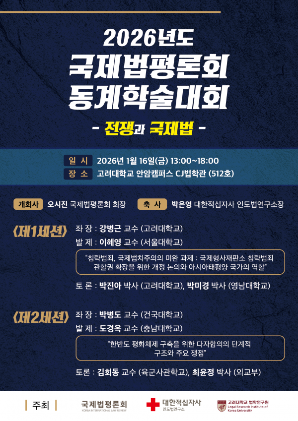 국제법평론회는 2026년 1월 16일(금) 대한적십자사 인도법연구소, 고려대학교 법학연구원 국제법연구센터와 공동으로 2026년도 동계학술대회를 개최합니다. 이번 학술대회의 주제는 “전쟁과 국제법”이며, 학술대회 프로그램은 아래 첨부한 포스터를 참조해주시기 바랍니다.