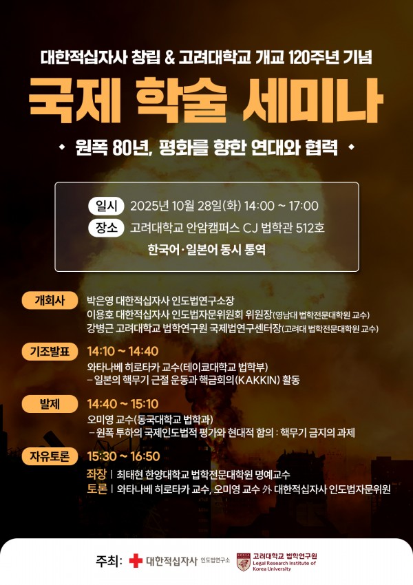 대한적십자사에서 원폭 80주년 국제 학술 세미나를 10월 28일(화) 고려대학교에서 개최합니다. 관심있는 학회 회원분들께서는 아래 포스터를 참고하시기 바랍니다.